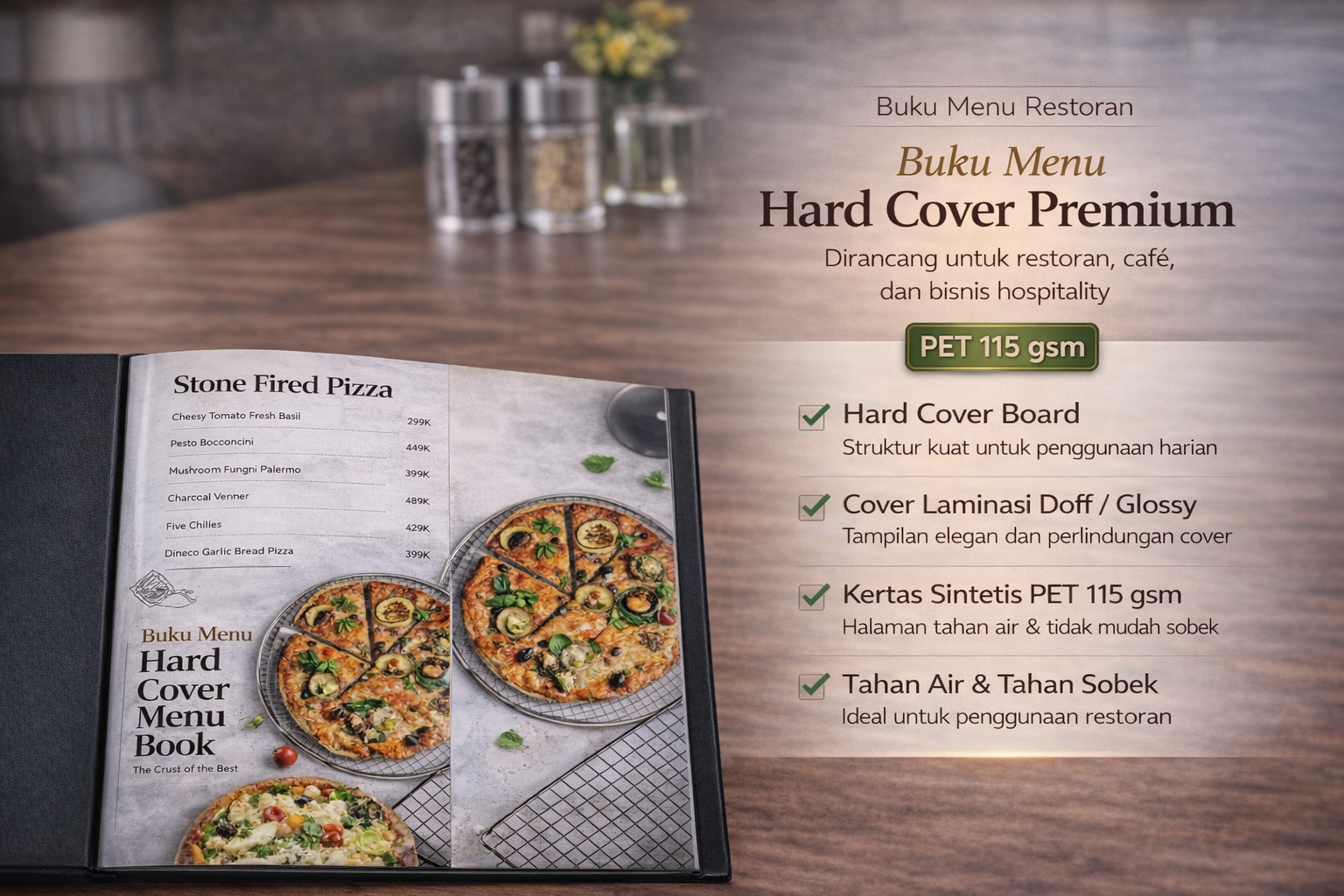 Dengan kombinasi hard cover dan bahan PET, buku menu tetap terlihat rapi di meja sekaligus cukup tahan untuk penggunaan sehari-hari.